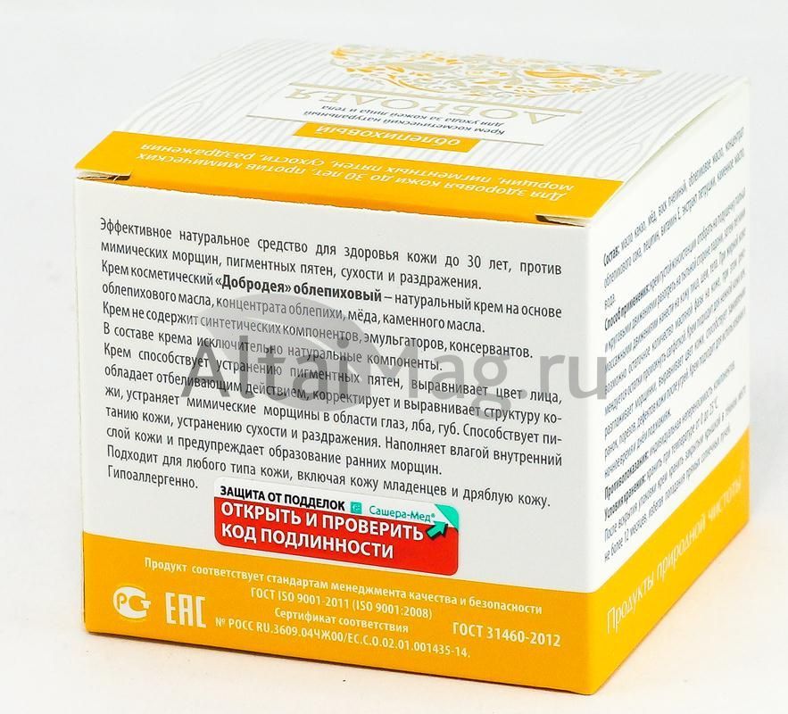 Крем «Облепиховый» серии «Добродея» способствует устранению пигментных пятен, выравнивает цвет лица, обладает отбеливающим действием, корректирует и выравнивает структуру кожи. Подходит для любого типа кожи, включая кожу младенцев и дряблую кожу. Крем гипоаллергенен.