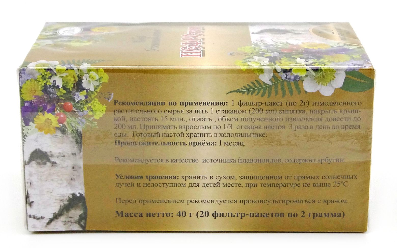 Трава спорыша, лист березы повислой, лист смородины черной, плоды шиповника майского, трава зимолюбки зонтичной, лист толокнянки обыкновенной, цветки лабазника вязолистного, трава золотарника обыкновенного, трава зверобоя продырявленного.Противопоказания: