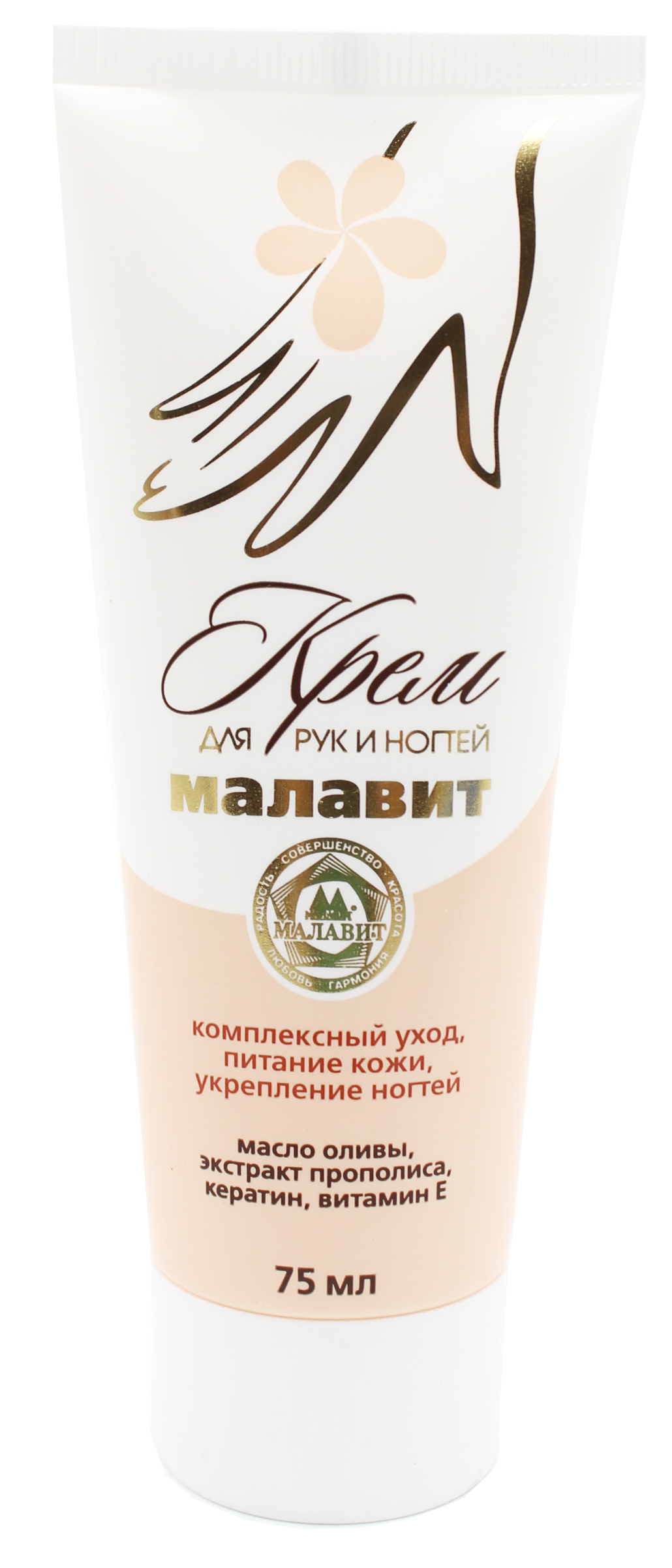Крем для рук и ногтей с маслом оливы, экстрактом прополиса, кератином, витамином Е. Обеспечивает необходимое питание и увлажнение кожи, способствует укреплению ногтей, усиливает их гибкость и гладкость. Создает вокруг кутикулы тонкую защитную пленку, которая предотвращает повреждения, вызванные внешними факторами. Содержит гигиеническое средство "Малавит".