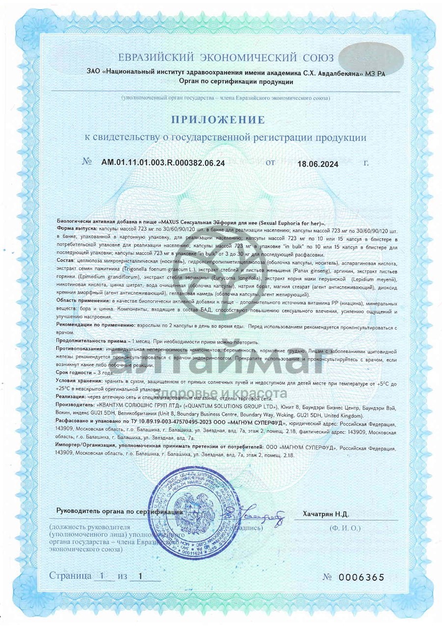 - Чтобы купить Maxus Sexual Euphoria для нее 60 капсул совершите всего несколько шагов: укажите количество продукта и нажмите на кнопку «Купить».