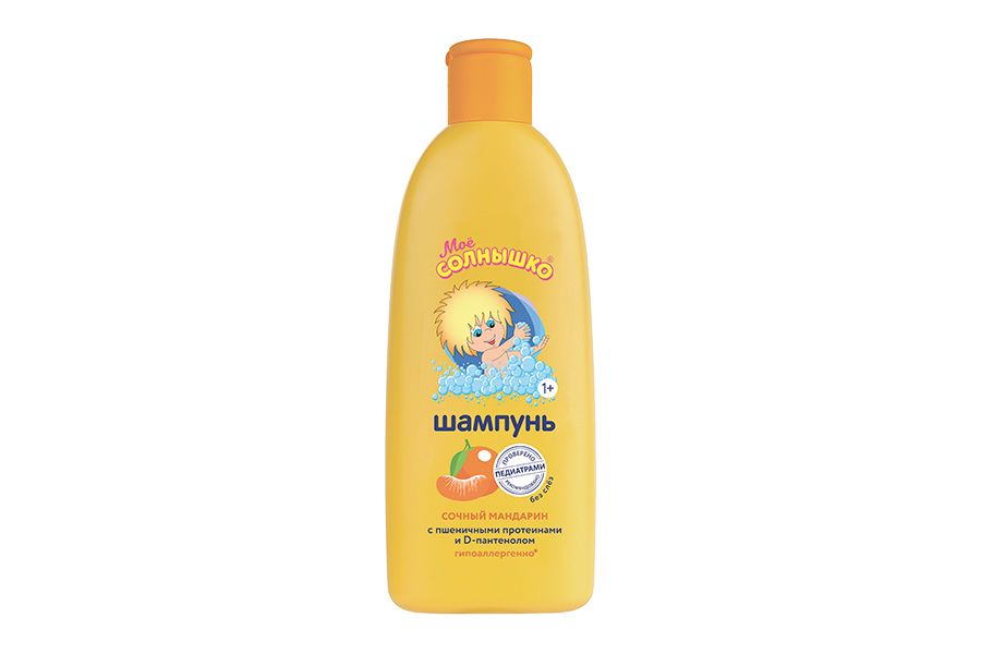 Нежный шампунь для волос «Сочный мандарин» серии «Моё солнышко» для ежедневного применения, бережно очищает волосы и кожу головы ребенка.